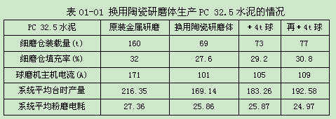 在之后的7月底和8月初,又逐步進(jìn)行了2次加球試驗(yàn),為防止往雙層隔倉(cāng)板的卸料倉(cāng)里竄球,用不銹鋼篩板做了一個(gè)喇叭筒,把卸料口邊緣加高了60mm。在保證質(zhì)量的前提下,臺(tái)時(shí)產(chǎn)量恢復(fù)到192.58t/h。換球后生產(chǎn)PC 32.5水泥的情況見(jiàn)表01-01。