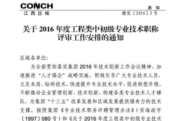 為全面貫徹落實(shí)集團(tuán)2016年技術(shù)創(chuàng)新工作會(huì)議精神,加速推進(jìn)“人才強(qiáng)企”戰(zhàn)略實(shí)施,積極引導(dǎo)廣大專業(yè)技術(shù)人員,立足本崗,鉆研技術(shù),快速提升專業(yè)技術(shù)水平,促進(jìn)轉(zhuǎn)型升級(jí),不斷推動(dòng)企業(yè)管理創(chuàng)新、技術(shù)創(chuàng)新,構(gòu)建各類專業(yè)技術(shù)人才梯隊(duì),為集團(tuán)“十三五”改革發(fā)展和區(qū)域發(fā)展提供強(qiáng)有力的技術(shù)支撐,按照集團(tuán)《專業(yè)技術(shù)職務(wù)評(píng)聘管理辦法》和《關(guān)于2016年度工程類中初級(jí)專業(yè)技術(shù)職稱評(píng)審工作安排的通知》要求,為切實(shí)做好江西區(qū)域2016年工程類中、初級(jí)專業(yè)技術(shù)資格職稱評(píng)審工作,區(qū)域行政人事專業(yè)組牽頭下發(fā)了《江西區(qū)域2016年度工程類中初級(jí)專業(yè)技術(shù)職稱評(píng)審工作安排的通知》。