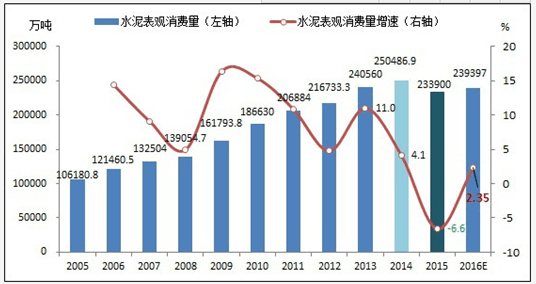 2016年全國水泥表觀消費量及增速預(yù)估
