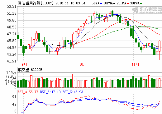 截止收盤,美國WTI原油12月期貨漲5.75%,報45.81美元/桶。布倫特原油1月期貨漲5.67%,報46.95美元/桶。