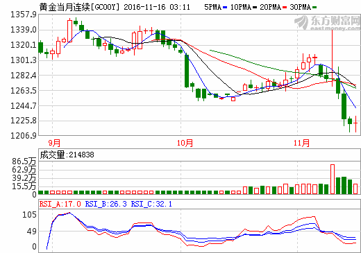 截止收盤,美國COMEX12月黃金期貨漲0.2%,報1224.50美元/盎司。