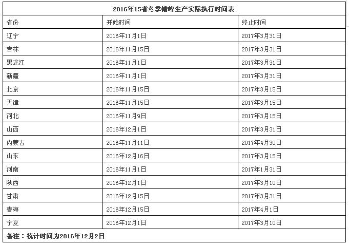 各地各企業(yè)對錯(cuò)峰生產(chǎn)的重視達(dá)到了前所未有的程度,所涉及省市自治區(qū)馬上行動(dòng),很快根據(jù)各自情況,因地制宜出臺實(shí)施文件,拿出了操作性極強(qiáng)的措施,有的地區(qū)甚至細(xì)化到點(diǎn)明哪一家企業(yè)的哪一條生產(chǎn)線應(yīng)該關(guān)停。與此同時(shí),各地的文件都部署了詳細(xì)的保障執(zhí)法措施和督查追責(zé)辦法。到目前為止,已經(jīng)落實(shí)2016年15省冬季錯(cuò)峰生產(chǎn)實(shí)際執(zhí)行時(shí)間表: