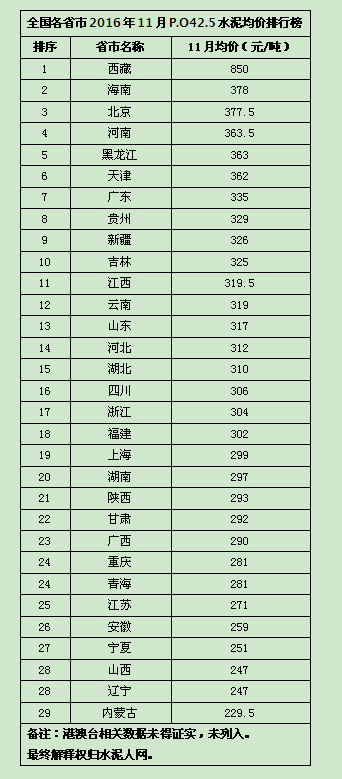 從榜中可以看出,西藏以850元/噸的均價,位居榜首。從2016年上半年開始,西藏水泥價格一路上漲,曾直逼1000元/噸大關。11月下旬開始,水泥價格有所松動,對11月均價有所打壓,截止12月7日,西藏水泥價格832元/噸,目前仍呈小幅下降趨勢。