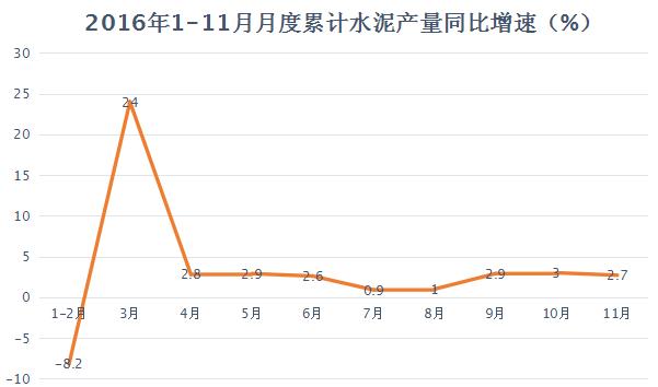 圖1 2016年1-11月月度累計(jì)水泥產(chǎn)量同比增速