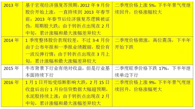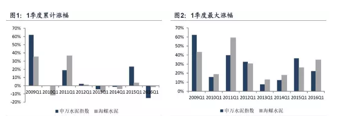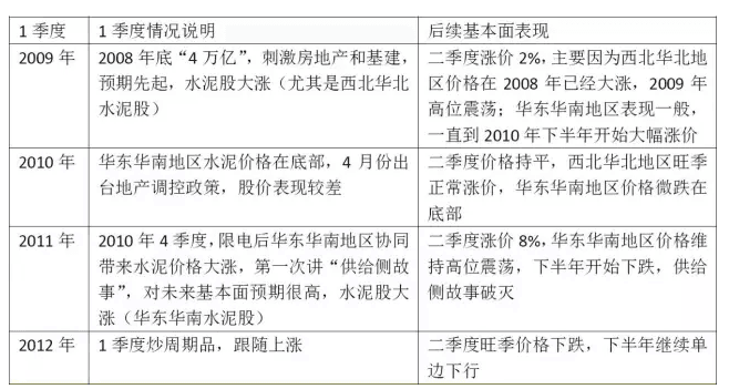 單看水泥股,是否也存在春季躁動?我們選取了2009年以來的數(shù)據(jù),分別用季度累計漲幅和季度內最大漲幅兩個指標來衡量;結論還是比較清晰:一方面,大部分年份1季度都是正收益(出現(xiàn)負收益的年份特征都很明顯,下文會說明),而且如果擇時得當,會有不錯斬獲(最大漲幅都比較大);另一方面,大部分年份,1季度的“最大漲幅”都大于其他三個季度,顯示出躁動性。