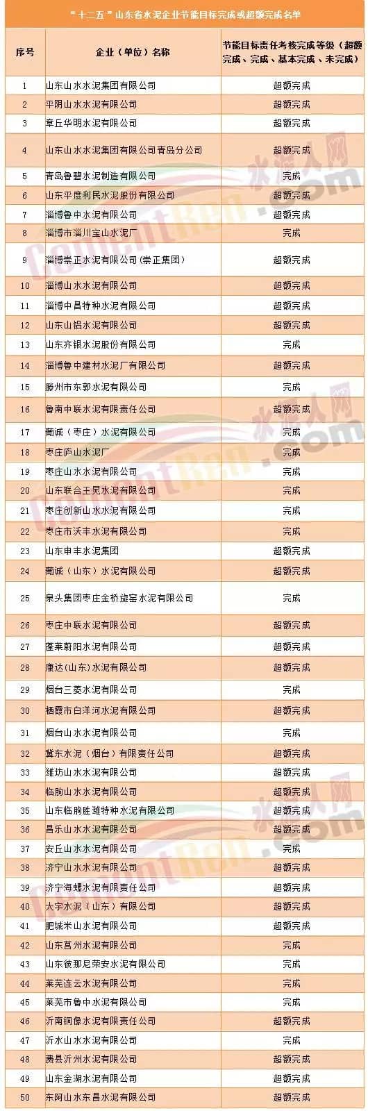 1月22日,根據(jù)《國家發(fā)展改革委辦公廳關于印發(fā)萬家企業(yè)節(jié)能目標責任考核實施方案的通知》(發(fā)改辦環(huán)資〔2012〕1923號)要求,山東省經(jīng)信委會同有關部門對全省1188家重點用能單位“十二五”節(jié)能目標完成情況和節(jié)能措施落實情況進行了考核,并將考核結果上報國家發(fā)展改革委。對超額完成和完成等次的單位予以通報表揚。值得慶幸的是,水泥行業(yè)沒有未完成等次的企業(yè)名單。有50家水泥企業(yè)完成或超額完成節(jié)能目標責任考核,其中,中建材、山水水泥、中聯(lián)水泥、海螺水泥等企業(yè)在列?,F(xiàn)公布如下: