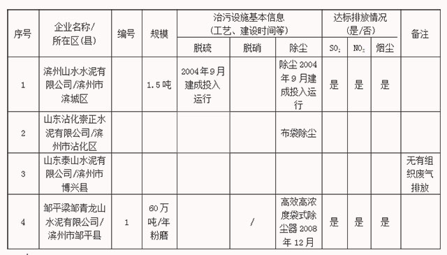 山東省濱州市落實《山東省區(qū)域性大氣污染物綜合排放標準》2016年12月份執(zhí)行情況“雙曬”清單已經(jīng)公布。其中含四家水泥企業(yè): 1 濱州山水水泥有限公司 2 山東沾化崇正水泥有限公司 3 山東泰山水泥有限公司 4 鄒平梁鄒青龍山水泥有限公司