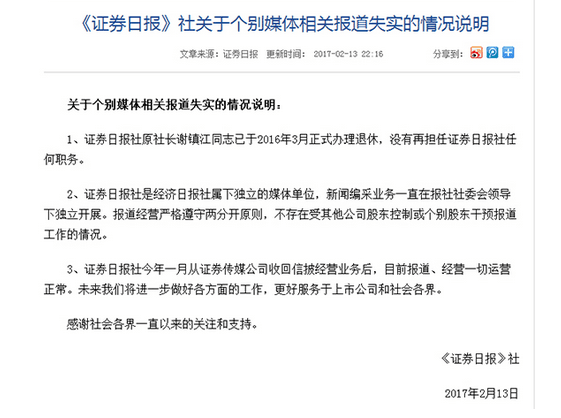 1.證券日?qǐng)?bào)社原社長謝鎮(zhèn)江同志已于2016年3月正式辦理退休,沒有再擔(dān)任證券日?qǐng)?bào)社任何職務(wù)。