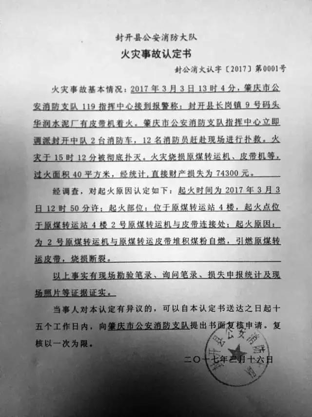 華潤水泥(封開)有限公司所在地肇慶市封開縣公安消防大隊(duì)已于昨日(3月16日)出具了火災(zāi)事故認(rèn)定書(封公消火認(rèn)字[2017]第0001號(hào))事故認(rèn)定書描述的起火原因?yàn)椋?號(hào)原煤轉(zhuǎn)運(yùn)機(jī)與原煤轉(zhuǎn)運(yùn)皮帶堆積煤粉自燃,引燃原煤轉(zhuǎn)運(yùn)皮帶,燒損斷裂。火災(zāi)燒損原煤轉(zhuǎn)運(yùn)機(jī)、皮帶機(jī)等,過火面積40平方米,直接財(cái)產(chǎn)損失為74300元。