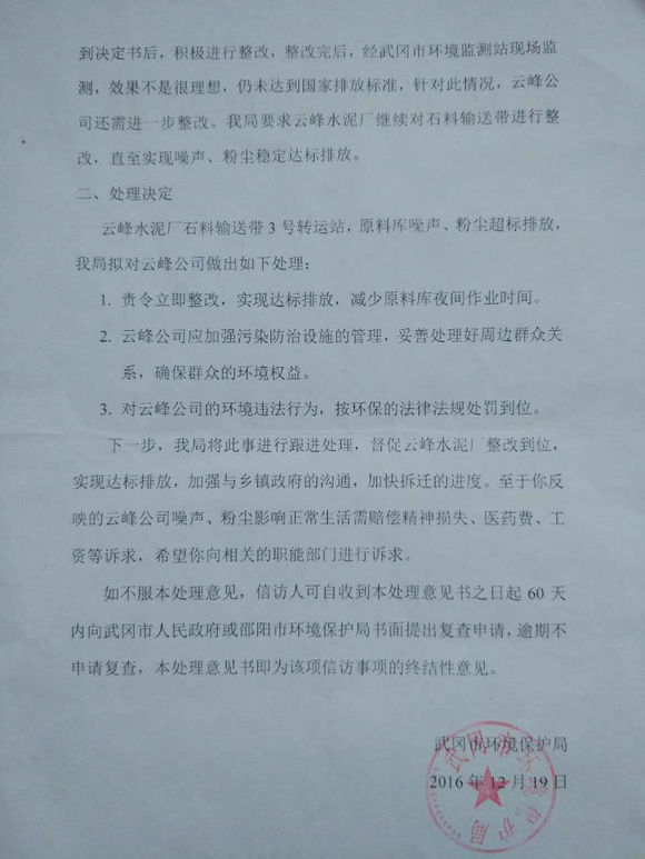 由于受武岡云峰水泥廠刺耳的噪聲和粉塵影響,我和我的家人心煩意亂、情緒緊張、頭昏腦脹,無(wú)法正常入睡,導(dǎo)致血壓升高,引發(fā)多種疾病,身體狀況不斷惡化。忍無(wú)可忍之下,我四處奔波,多次請(qǐng)求環(huán)保部門(mén)出面處理。2016年12月19日,武岡市環(huán)保局終于作出了《關(guān)于張先斌同志反映云峰水泥廠石料輸送帶、原料庫(kù)噪聲、粉塵影響正常生活的調(diào)查處理回復(fù)》(見(jiàn)圖三和圖四),承認(rèn)石料輸送帶、原料庫(kù)與我家約50米,且對(duì)我家的生活造成一定的影響;經(jīng)過(guò)整改,仍未達(dá)到國(guó)家的排放標(biāo)準(zhǔn)。為此,環(huán)保局做出了以下三個(gè)處理決定。然而,該處理決定問(wèn)題太多,我們無(wú)法接受。