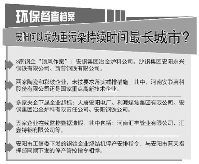 大唐安陽電廠氮氧化物多次超標(biāo);利源煤焦集團(tuán)有限公司4號焦?fàn)t2016年2月、3月、4月、5月SO2月均值超標(biāo);安鋼集團(tuán)冶金爐料有限責(zé)任公司回轉(zhuǎn)窯粉塵無組織揚(yáng)散較重;安陽鋼鐵公司夜間廠區(qū)無組織排放嚴(yán)重,130噸轉(zhuǎn)爐車間廢鋼收集工段揚(yáng)塵較重,廠內(nèi)鐵道南側(cè)一工段煙塵無組織排放。