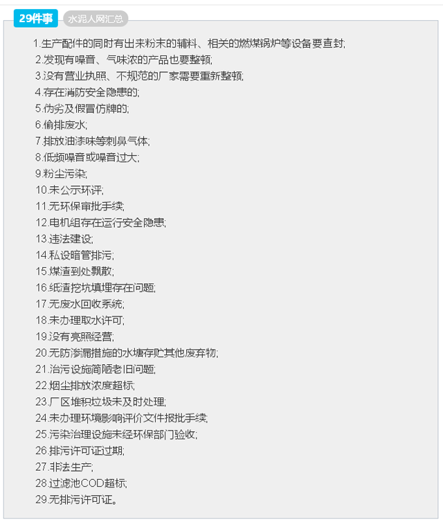 今年2月15日-3月15日,中央環(huán)保督察組會(huì)同北京市,天津市,河北省石家莊、廊坊、保定、唐山、邯鄲、邢臺(tái)、滄州、衡水市,山西省太原、臨汾市,山東省濟(jì)南、德州市,河南省鄭州、鶴壁、焦作、安陽市6個(gè)省(市)開展了2017年度第一季度空氣質(zhì)量專項(xiàng)督查,發(fā)現(xiàn)問題不少。今年余下的時(shí)間,中央環(huán)保督查組將對(duì)剩下的15個(gè)省份進(jìn)行環(huán)保督查全覆蓋,包括新疆、西藏、貴州、湖南、安徽、四川、山西、山東、天津、海南、遼寧、吉林、浙江、上海、福建等。環(huán)保部提醒各企業(yè):以下29點(diǎn)沒做好,永遠(yuǎn)別想開工!水泥企業(yè)要注意啦!