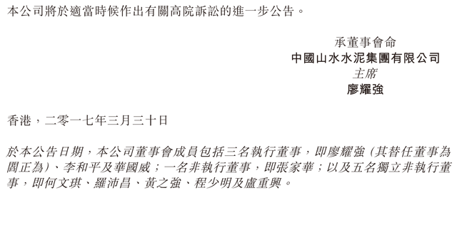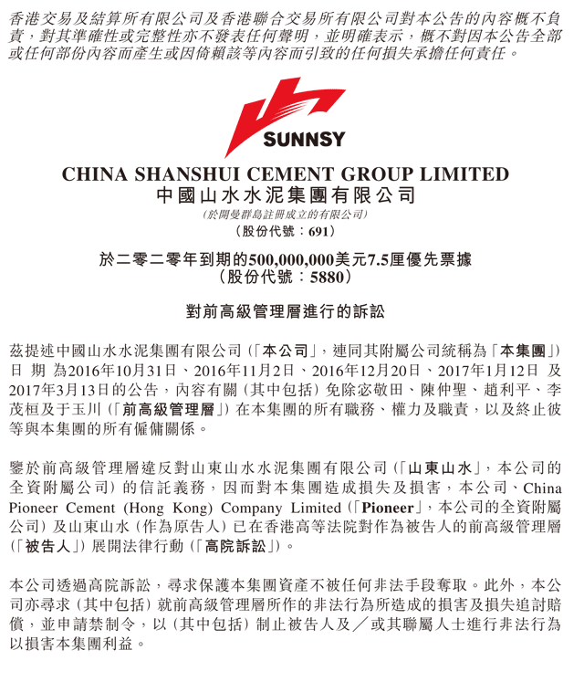 鑒于前高級(jí)管理層違反對公司全資附屬公司山東山水的信托義務(wù),因而對集團(tuán)造成損失及損害,公司、全資附屬公司China Pioneer Cement (Hong Kong) Company Limited及山東山水(作為原告人)已在香港高等法院對作為被告人的前高級(jí)管理層展開法律行動(dòng)。