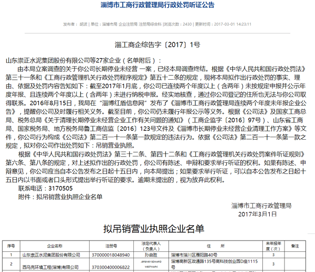 2016年8月15日,淄博市工商局在“淄博紅盾信息網”發(fā)布了《淄博市工商行政管理局連續(xù)兩個年度未年報企業(yè)公告》,提醒上述公司及時履行相關義務。截 至 2017年3月1日,上述公司仍未履行年報公示等義務。根據相關規(guī)定,淄博市工商局決定對上述公司予以吊銷營業(yè)執(zhí)照。