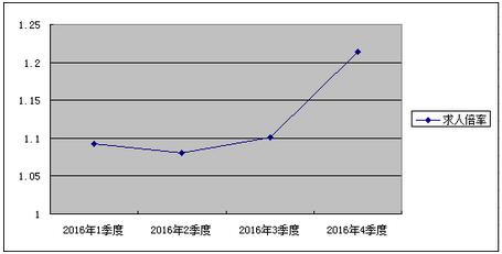 (二)勞動力市場供需平衡,就業(yè)結(jié)構不斷優(yōu)化。2016年第四季度,全省各類用人單位共提供空缺崗位44.14萬個,求職總?cè)藬?shù)為36.37萬,求人倍率為1.21,其余三個季度的求人倍率也均大于1(如下圖)??偟膩砜?,湖南省人力資源市場供求比例保持動態(tài)平衡,就業(yè)崗位供大于求。隨著湖南省產(chǎn)業(yè)結(jié)構調(diào)整不斷推進,服務業(yè)快速發(fā)展,省內(nèi)就業(yè)結(jié)構進一步優(yōu)化。從產(chǎn)業(yè)用工需求看,第三產(chǎn)業(yè)用工需求占用工總需求的58.0%,比重較上年提高1.7個百分點。另外,作為制造業(yè)大省,近年來,湖南對接中國制造2025不斷提速,向著制造業(yè)強省的目標奮力邁進。2016年,全省制造業(yè)用工需求仍居各行業(yè)之首,占用工總需求比重的31.0%。