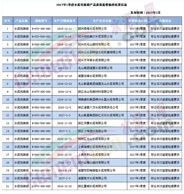 3月29日,紹興市質(zhì)量技術(shù)監(jiān)督局官網(wǎng)公布2017年一季度紹興市水泥包裝袋產(chǎn)品市級監(jiān)督抽查結(jié)果(總體評價類),抽查了柯橋區(qū)、上虞區(qū)和嵊州市等6個地區(qū)21家企業(yè)的21批次水泥包裝袋產(chǎn)品,不合格0批次。