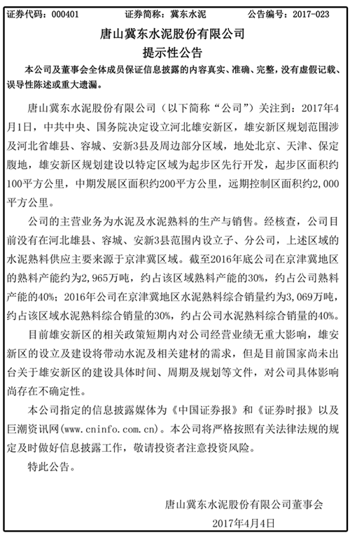 冀東水泥回應:公司在京津冀區(qū)域水泥銷售價格上漲,對公司利潤影響暫無法做定量判斷,但有一定正向影響;因目前國家尚未出臺關于雄安新區(qū)的建設具體時間、周期及規(guī)劃等文件,對公司具體影響尚存在不確定性;公司目前沒有在河北雄縣、容城、安新3縣范圍內設立子、分公司。