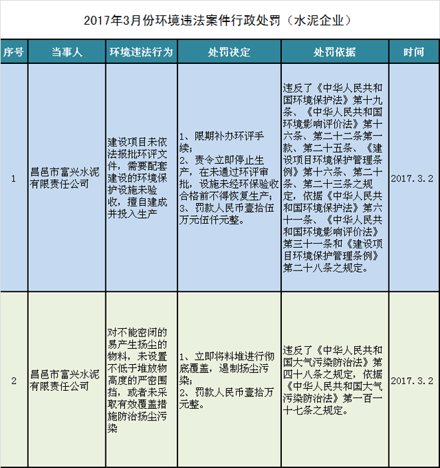 據(jù)處罰信息顯示,昌邑市富興水泥有限責任公司因“建設(shè)項目未依法報批環(huán)評文件,需要配套建設(shè)的環(huán)境保護設(shè)施未驗收,擅自建成并投入生產(chǎn)”和“對不能密閉的易產(chǎn)生揚塵的物料,未設(shè)置不低于堆放物高度的嚴密圍擋,或者未采取有效覆蓋措施防治揚塵污染”等環(huán)境違法行為分別被處以“限期補辦環(huán)評手續(xù);責令立即停止生產(chǎn),在未通過環(huán)評審批,設(shè)施未經(jīng)環(huán)保驗收合格前不得恢復(fù)生產(chǎn);罰款人民幣壹拾伍萬元伍仟元整”和“立即將料堆進行徹底覆蓋,遏制揚塵污染;罰款人民幣壹拾萬元整”處罰。