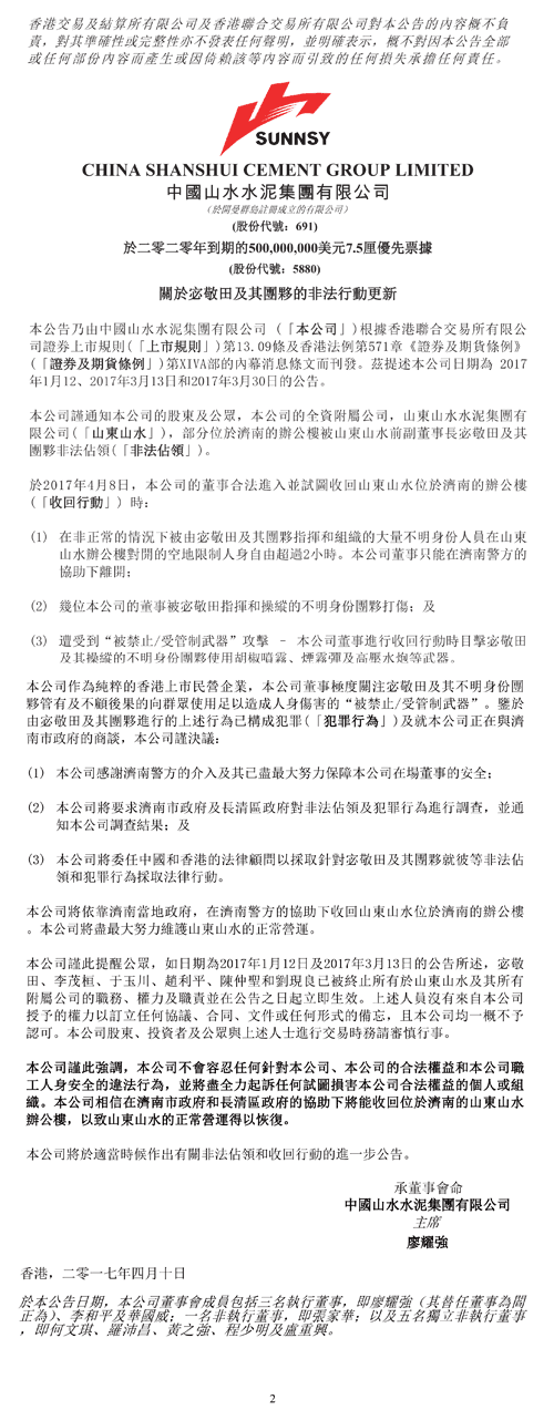山水水泥(00691.HK)早間公告,公司部分位于濟(jì)南的辦公樓被山東山水前副董事長宓敬田及其團(tuán)伙非法占領(lǐng)。其中,公司董事被由宓敬田及其團(tuán)伙在山東山水辦公樓限制人身自由超過2小時,最終只能在濟(jì)南警方的協(xié)助下離開。公司將盡全力起訴任何試圖損害公司合法權(quán)益的個人或組織,委任法律顧問對上述非法占領(lǐng)和犯罪行為采取法律行動。公司相信在濟(jì)南市政府和長清區(qū)政府的協(xié)助下將能收回位于濟(jì)南的山東山水辦公樓。