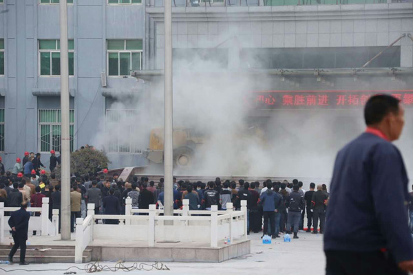 由于辦公樓外有鋼結(jié)構(gòu)大門,來(lái)者未能第一時(shí)間破門。“大概僵持了兩個(gè)小時(shí)左右,他們搶奪了廠區(qū)內(nèi)一輛推土機(jī)撞擊大門。”該人士告訴記者,鋼結(jié)構(gòu)大門瞬間被撞爛,鋼化玻璃散落一地。
