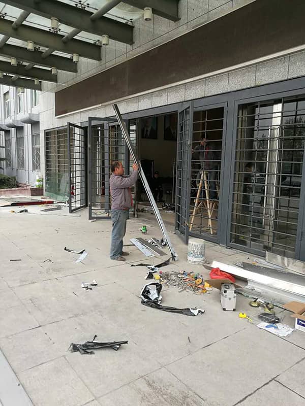 山水集團(tuán)辦公樓被撞倒的玻璃門