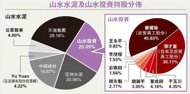 現(xiàn)時(shí)山水投資與亞泥現(xiàn)各持山水水泥25.09%及20.9%股權(quán)(見圖),根據(jù)本報(bào)獲得資料顯示,亞泥曾與山水水泥前董事李茂桓、山水集團(tuán)副總經(jīng)理趙東平,以及羅夏信律師事務(wù)所的3名律師,兩度召開員工大會(huì),建議合共2631名員工以每股4.4元價(jià)格,將手中所持全部山水股份售予亞泥,收購價(jià)較山水水泥停牌前報(bào)價(jià)折讓三成。若成事,亞泥將斥資37億元。