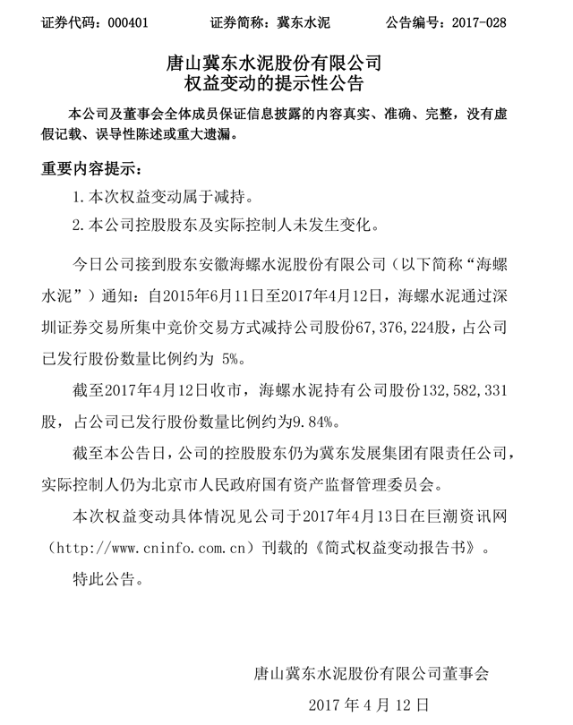 4月12日晚間,冀東水泥(000401)公告稱,當日接到股東海螺水泥(600585)通知,自2015年6月11日至2017年4月12日,海螺水泥通過深圳證券交易所集中競價交易方式減持公司股份67,376,224股,占公司已發(fā)行股份數(shù)量比例約5%。