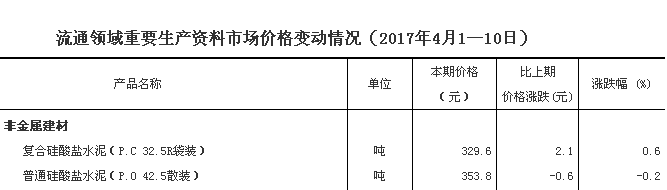 據(jù)對24個省(區(qū)、市)流通領(lǐng)域9大類50種重要生產(chǎn)資料市場價(jià)格的監(jiān)測顯示,2017年4月上旬,與3月下旬相比,20種產(chǎn)品價(jià)格上漲,22種下降,8種持平。其中非金屬建材水泥產(chǎn)品本期價(jià)格有漲有降。其中復(fù)合硅酸鹽水泥(P.C32.5R袋裝水泥本期價(jià)格329.6元,同比價(jià)格上漲0.6個百分點(diǎn);普通硅酸鹽水泥(P.O 42.5散裝水泥,本期價(jià)格353.8元,同比下跌0.2個百分點(diǎn)。