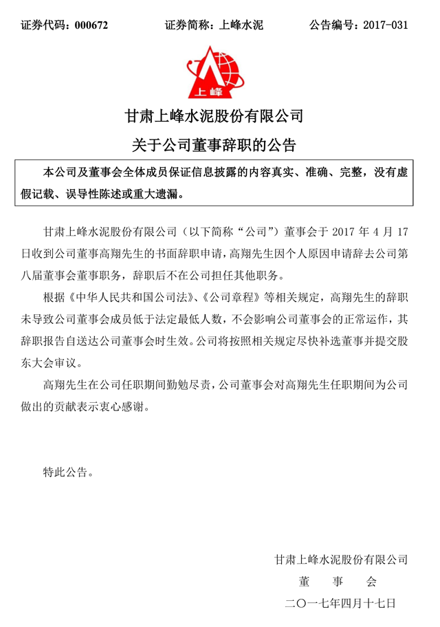 上峰水泥4月17日發(fā)布晚間公告稱(chēng),董事會(huì)收到公司董事高翔先生的書(shū)面辭職申請(qǐng),高翔先生因個(gè)人原因申請(qǐng)辭去公司第八屆董事會(huì)董事職務(wù),辭職后不在公司擔(dān)任其他職務(wù)。