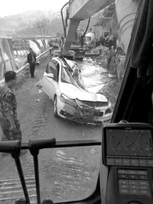 救援人員趕到現(xiàn)場后,破拆轎車后發(fā)現(xiàn)轎車變形嚴(yán)重,無法實(shí)施救援,于是有關(guān)部門又調(diào)來一輛吊車,將罐車吊起。
