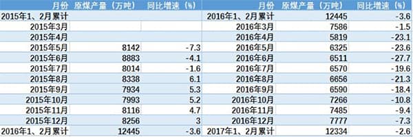 查閱山西省近兩年來原煤生產(chǎn)情況,發(fā)現(xiàn)2016年同比增速下降幅度確實(shí)相當(dāng)大,降幅最高的6月份達(dá)到27.7%,而之前的2015年原煤產(chǎn)量增速還在正、負(fù)間徘徊。2017年前兩個(gè)月則降幅有所收窄。