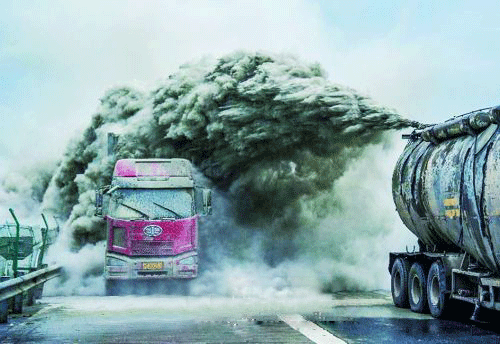 雖然已經過去很久,但是說起拍照當天的情景,姜豪仍然記憶猶新。那天他和同事接到高速路段上發(fā)生緊急事故的報警后,迅速趕到事故現(xiàn)場?,F(xiàn)場起火的貨車??吭谟猜芳缟?,車廂里不斷有黃色濃霧冒出,還夾雜著黑煙和火苗。