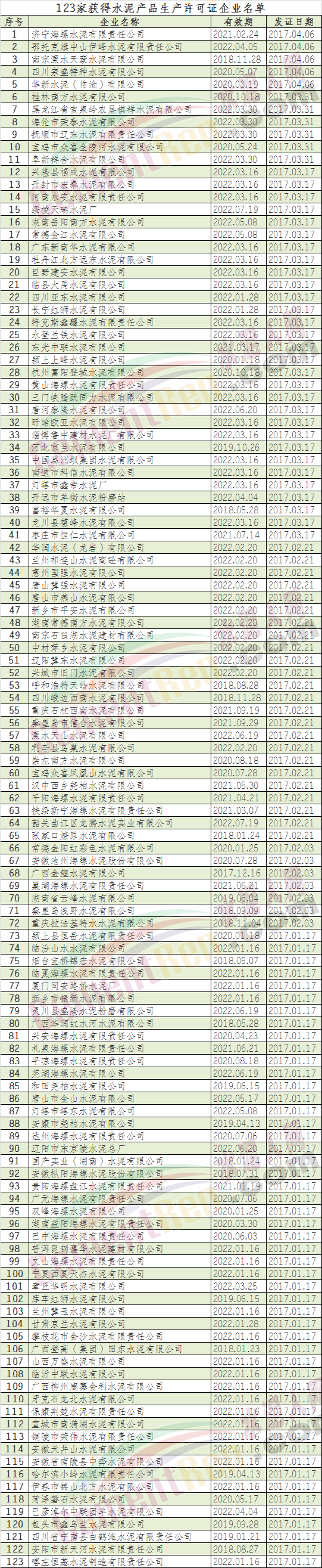 日前,國家質(zhì)量監(jiān)督檢驗檢疫總局公布了2017年1月至4月獲證企業(yè)名單,水泥行業(yè)獲得水泥產(chǎn)品生產(chǎn)許可證的企業(yè)有123家,水泥人網(wǎng)匯總列表如下: