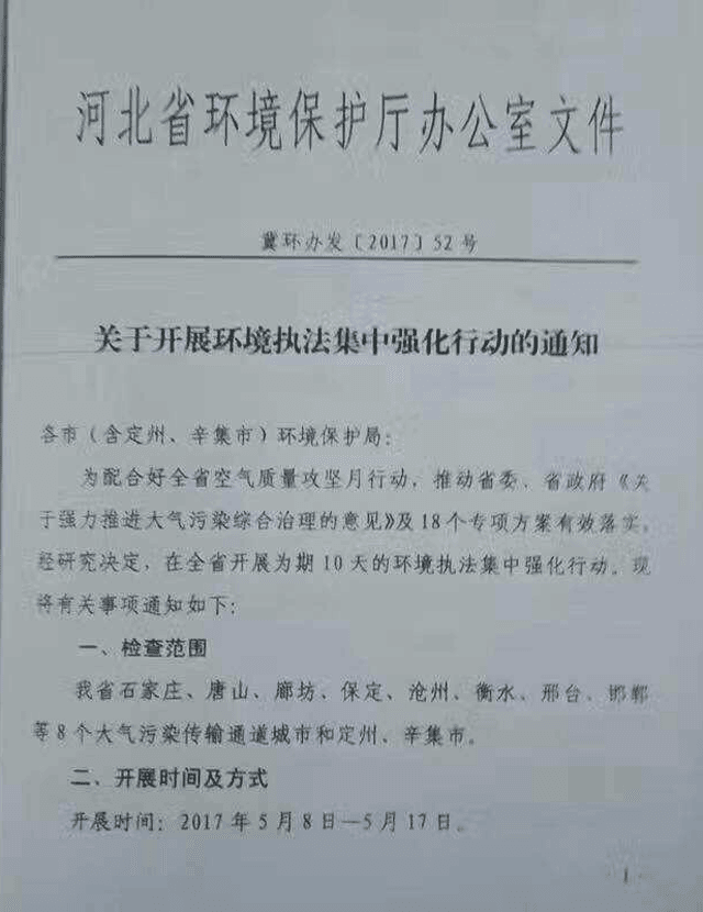 日前,河北省環(huán)境保護廳下發(fā)《關于開展環(huán)境執(zhí)法集中強化行動的通知》,通知要求唐山、廊坊、邢臺、邯鄲等8個大氣污染傳輸通道城市于2017年5月8日-5月17日,加大執(zhí)行力度,嚴厲查處大氣環(huán)境違法行為,重點行業(yè)為水泥等常年運行燃煤鍋爐等高架源,不能穩(wěn)定達標排放企業(yè)一律停產(chǎn)整頓。