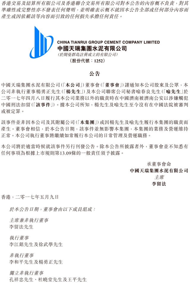 中國(guó)天瑞水泥昨日晚間公告,非執(zhí)行董事楊勇正及聯(lián)席公司秘書(shū)喻春良於4月8日履行公司業(yè)務(wù)以外的職責(zé)時(shí),在中國(guó)濟(jì)南被濟(jì)南公安以涉嫌觸犯中國(guó)刑法扣留。兩人至今沒(méi)有在中國(guó)法院被審判或被定罪。該事件并非因公司或因兩人履行公司職責(zé)而產(chǎn)生,相信并無(wú)影響公司及公司業(yè)務(wù),公司營(yíng)運(yùn)維持正常。