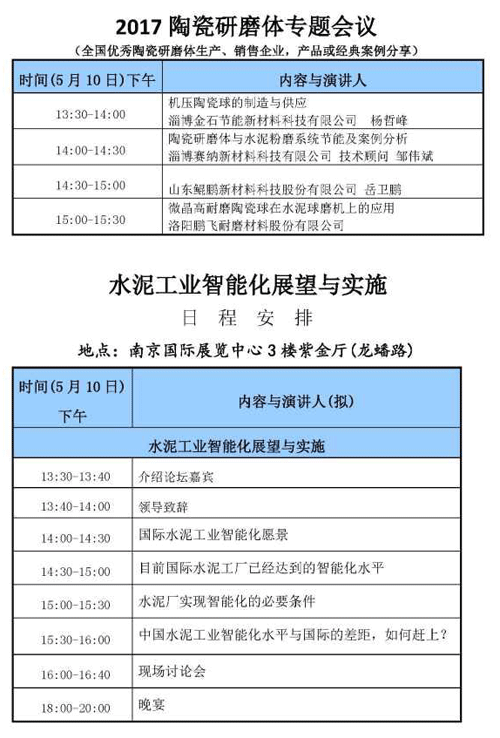 2017年陶瓷研磨體專題會議,即全國優(yōu)秀陶瓷研磨體生產(chǎn)、銷售企業(yè)產(chǎn)品或經(jīng)典案例分享 將于5月10日下午舉行。同期,水泥工業(yè)智能化展望與實施將于5月10日下午在南京國際展覽中心3樓紫金廳進行。具體安排如下: