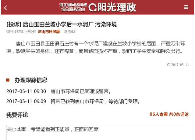 近日,河北省網(wǎng)絡(luò)問政綜合服務(wù)平臺,陽光理政欄目接到投訴稱唐唐山市玉田縣玉田鎮(zhèn)石莊村有一個水泥廠建設(shè)在蘭坡小學(xué)校的后面,嚴(yán)重污染環(huán)境,影響學(xué)生的身體,還有噪音,而且路面損壞嚴(yán)重,影響了學(xué)生安全和群眾出行。今日09:09該留言已轉(zhuǎn)到唐山市環(huán)保局,09:30唐山市環(huán)保局已受理該留言。