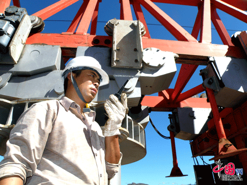 寬扎河特大橋施工現(xiàn)場,中國工人指揮大型架橋機(jī)操作