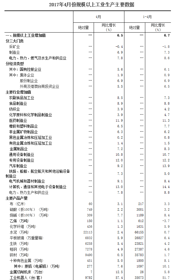 分行業(yè)看,4月份,41個(gè)大類行業(yè)中有36個(gè)行業(yè)增加值保持同比增長。其中,農(nóng)副食品加工業(yè)增長8.5%,紡織業(yè)增長3.9%,化學(xué)原料和化學(xué)制品制造業(yè)增長3.9%,非金屬礦物制品業(yè)增長6.3%,黑色金屬冶煉和壓延加工業(yè)增長0.2%,有色金屬冶煉和壓延加工業(yè)增長1.4%,通用設(shè)備制造業(yè)增長10.8%,專用設(shè)備制造業(yè)增長12.0%,汽車制造業(yè)增長9.2%,鐵路、船舶、航空航天和其他運(yùn)輸設(shè)備制造業(yè)增長7.3%,電氣機(jī)械和器材制造業(yè)增長9.1%,計(jì)算機(jī)、通信和其他電子設(shè)備制造業(yè)增長13.0%,電力、熱力生產(chǎn)和供應(yīng)業(yè)增長7.8%。