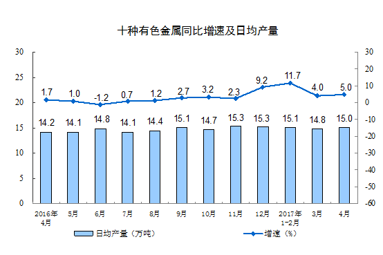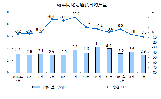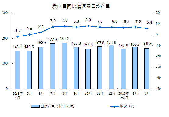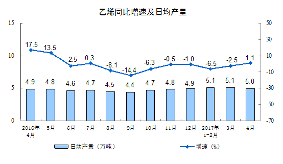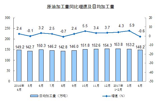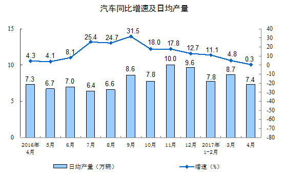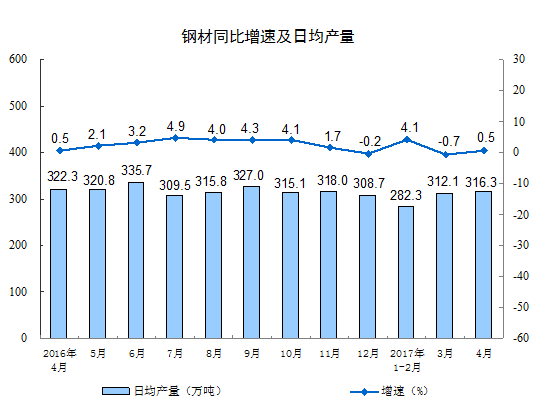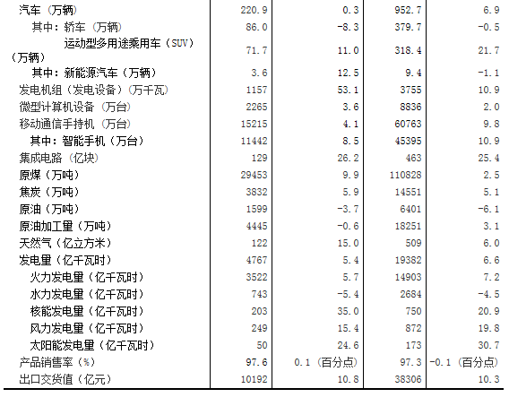 分產(chǎn)品看,4月份,596種產(chǎn)品中有419種產(chǎn)品同比增長。其中,鋼材9490萬噸,同比增長0.5%;水泥22113萬噸,增長 2.4%;十種有色金屬451萬噸,增長5.0%;乙烯150萬噸,增長1.1%;汽車220.9萬輛,增長0.3%;轎車86.0萬輛,下降8.3%;發(fā)電量4767億千瓦時(shí),增長5.4%;原油加工量4445萬噸,下降0.6%。