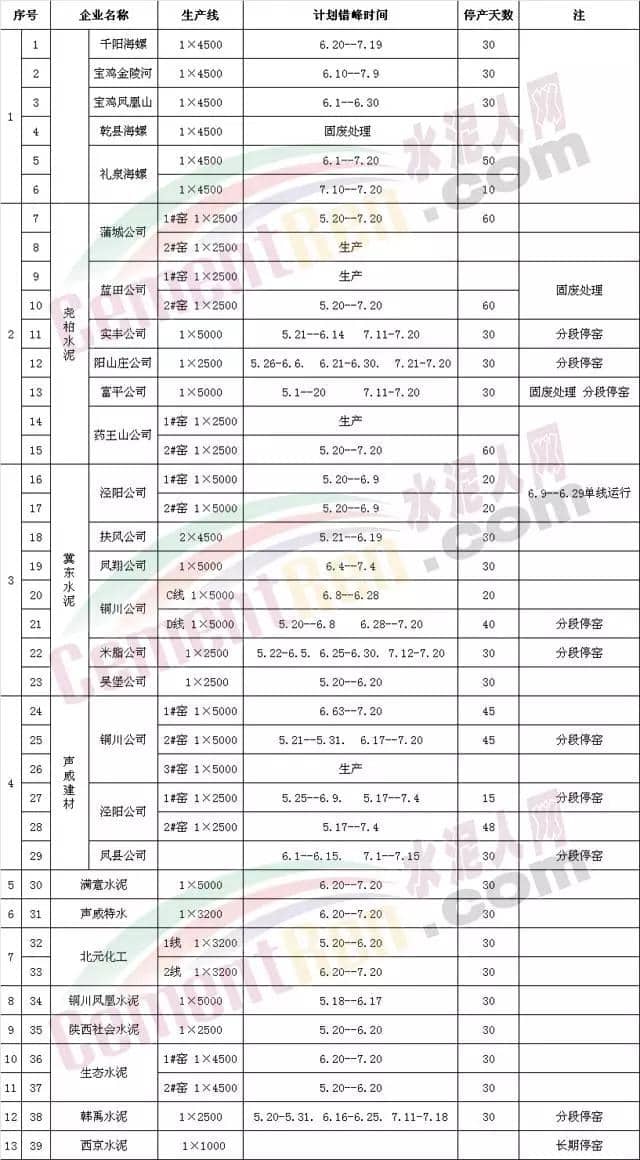 本次錯(cuò)峰停產(chǎn)涉及海螺水泥下屬5家企業(yè),共6條生產(chǎn)線;堯柏水泥下屬6家企業(yè)共9條熟料生產(chǎn)線;冀東水泥下屬6家企業(yè)共9條熟料生產(chǎn)線;聲威建材下屬3家企業(yè)共6條生產(chǎn)線;陜西滿意水泥有限責(zé)任公司 1條生產(chǎn)線、銅川聲威特種水泥有限公司 1條生產(chǎn)線、北元化工集團(tuán)水泥公司2條生產(chǎn)線、陜西銅川鳳凰建材有限公司1條生產(chǎn)線、陜西社會(huì)水泥有限責(zé)任公司1條生產(chǎn)線、陜西生態(tài)水泥股份有限公司2條生產(chǎn)線、韓城韓禹建材礦業(yè)有限責(zé)任公司1條生產(chǎn)線。西安西京水泥有限責(zé)任公司一條日產(chǎn)1000噸生產(chǎn)線長(zhǎng)期停產(chǎn)。