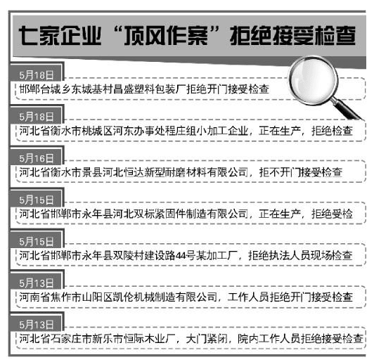 5月15日,第十督查組對河北省邯鄲市永年縣河北雙標緊固件制造有限公司進行檢查時,該公司正在生產,該公司拒絕檢查;當日,督查組在河北省邯鄲市永年縣對雙陵村建設路44號某加工廠檢查時,該廠正在生產,拒絕執(zhí)法人員現場檢查。