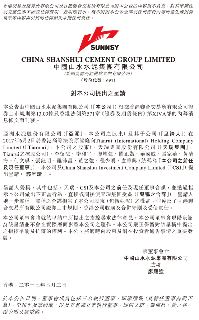 山水水泥(00691)發(fā)布公告,該公司股東亞洲水泥股份有限公司及其子公司(呈請人)在2017年6月2日于香港高等法院原訟庭向Tianrui (International) Holding Company Limited(Tianrui,該公司股東)、天瑞集團股份有限公司(Tianrui的控股公司)、李留法、李和平、廖耀強、閻正為、華國威、張家華、黃清海、何文琪、張鈺明、羅沛昌、黃之強、程少明、盧重興(統(tǒng)稱為該公司前任及現(xiàn)任董事)、該公司及China Shanshui Investment Company Limited(CSI)提出呈請。