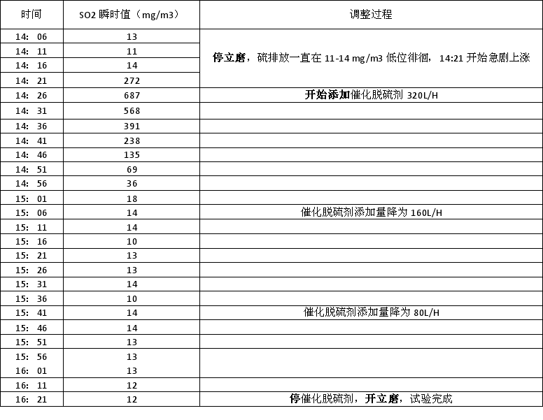 催化脫硫劑分別添加量為320l/h(40min)、160l/h(35min)、80l/h(40min),硫排放都處于最低點,分析得出催化脫硫劑添加過量,由于立磨停機時間受限,具體用量沒有最后得出,但可以定性的得出結(jié)論,在當(dāng)前的本底硫排放情況下,催化脫硫劑摻加量小于80l/h能保證SO2排放控制環(huán)保標(biāo)準(zhǔn)以下。