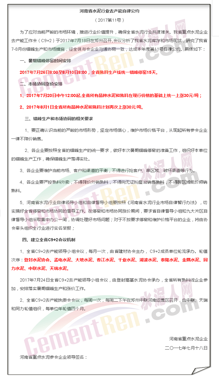 “自律公約”要求河南全省熟料生產(chǎn)線(xiàn)2017年7月26日8:00至8月10日8:00,統(tǒng)一錯(cuò)峰停窯15天;2017年7月20日中午12:00起,全省所有品種水泥和熟料在現(xiàn)行價(jià)格的基礎(chǔ)上統(tǒng)一上漲30元/噸;2017年8月1日全省所有品種水泥和熟料計(jì)劃再次上漲30元/噸。