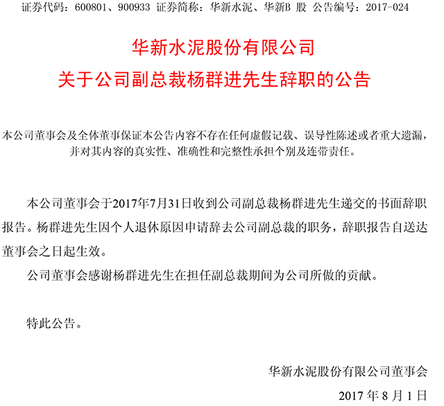 7月31日晚間,華新水泥發(fā)布公告稱,公司董事會于2017年7月31日收到公司副總裁楊群進(jìn)先生遞交的書面辭職報(bào)告。楊群進(jìn)先生因個(gè)人退休原因申請辭去公司副總裁的職務(wù),辭職報(bào)告自送達(dá)董事會之日起生效。