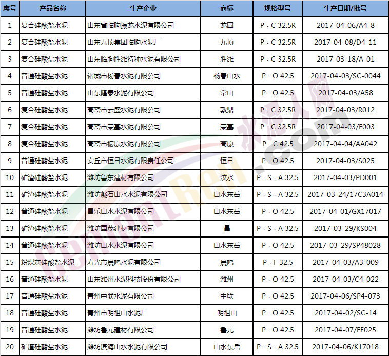 濰坊市2017年第2批市級監(jiān)督抽查水泥產(chǎn)品質(zhì)量結(jié)果匯總表