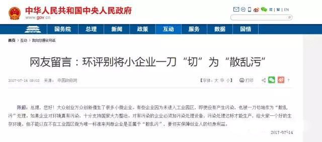 陳超:總理,您好!大眾創(chuàng)業(yè)萬眾創(chuàng)新催生了很多小微企業(yè)。有些企業(yè)因?yàn)槲催M(jìn)入工業(yè)園區(qū),即使沒有產(chǎn)生污染,也被一刀切地作為“散亂污”處理。如果企業(yè)對環(huán)境真有污染,十分支持國家大力整治。對有污染的企業(yè)必須加污染處理設(shè)備,污染處理達(dá)標(biāo)才能生產(chǎn),給大家一個好的生存環(huán)境。但不能以在不在工業(yè)園區(qū)做為唯一標(biāo)準(zhǔn)來判斷企業(yè)是否屬于“散亂污”,要切實(shí)保障創(chuàng)業(yè)人的切身利益。