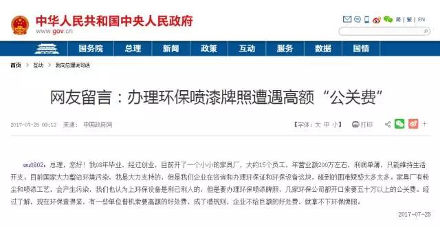 wu0802:總理,您好!我08年畢業(yè),經(jīng)過創(chuàng)業(yè),目前開了一個小小的家具廠,大約15個員工,年?duì)I業(yè)額200萬左右,利潤單薄,只能維持生活開支。目前國家大力整治環(huán)境污染,我是大力支持的,但是我們企業(yè)在咨詢和辦理環(huán)保證和環(huán)保設(shè)備這塊,碰到的困難疑惑太多太多。家具廠有粉塵和噴漆工藝,會產(chǎn)生污染,我們也認(rèn)為上環(huán)保設(shè)備是利已利人的,但是要辦理環(huán)保噴漆牌照,幾家環(huán)保公司都開口索要五十萬以上的公關(guān)費(fèi)。經(jīng)過了解,現(xiàn)在環(huán)保查得緊,有一些單位借機(jī)索要高額的好處費(fèi),成了潛規(guī)則,企業(yè)不給巨額的好處費(fèi),就拿不下環(huán)保牌照。