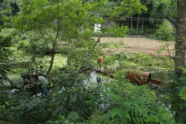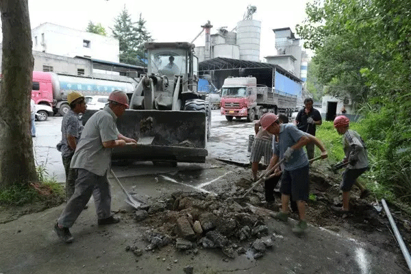 8月11日上午,記者在宇基水泥廠看到,工廠已全面停產(chǎn),在廠區(qū)水泥排料口已進行密封處理;在廠房河道附近,工人們正在緊張建設(shè)水槽、沉砂池、限流井,以保證廢水過濾處理;河道上,工人們正在進行打撈水葫蘆和撈淤整治。